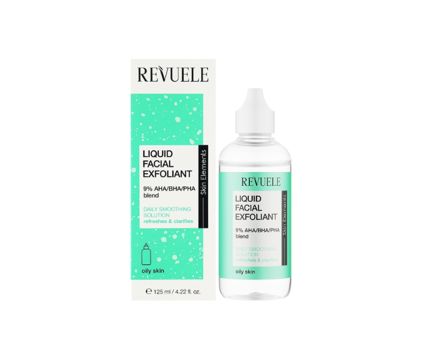 REVUELE Liquid Facial Exfoliant 9% AHA/BHA/PHA Blend is a gentle daily exfoliant designed for oily skin. Combining AHA, BHA, and PHA acids, it helps remove dead skin cells, smooth skin texture, even out tone, and reveal a refreshed, clarified complexion.