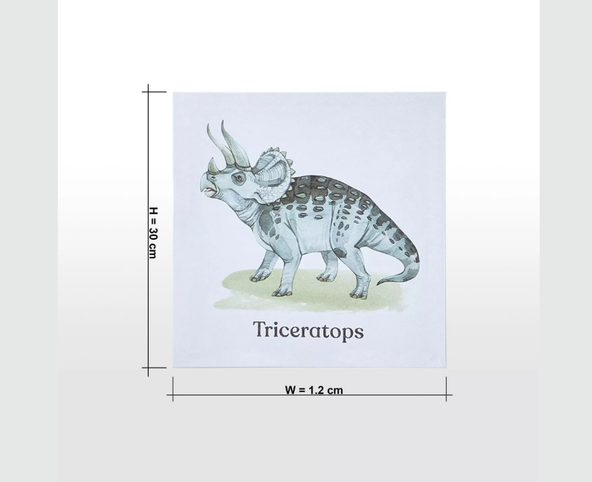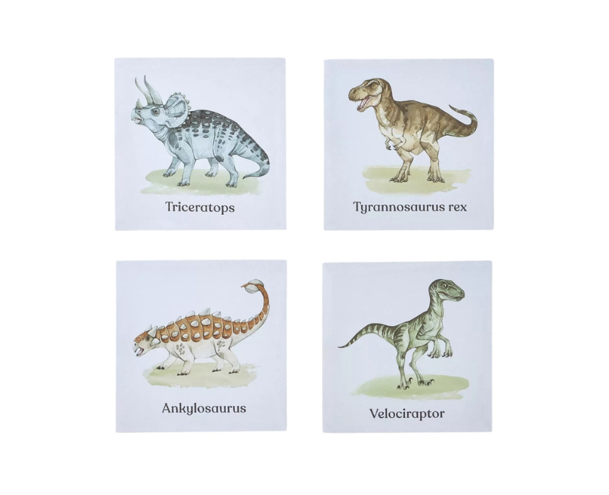 This set of four dinosaur wall canvases measures 30 by 30 by 1.2 cm and features detailed illustrations of Tyrannosaurus Rex, Triceratops, Velociraptor, and Ankylosaurus with their names. Perfect for a dinosaur themed room, they spark imagination and add educational value. Durable and visually appealing, they enhance any child’s bedroom décor.