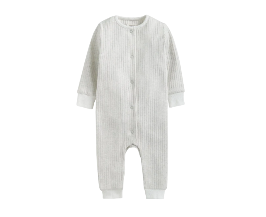 This grey ribbed long-sleeve baby romper is made from soft, breathable cotton for all-day comfort. It features convenient popper fastenings for easy dressing and diaper changes, and long sleeves to keep your little one warm. Perfect for layering or wearing on its own, it pairs effortlessly with other baby essentials for a cozy, everyday look.