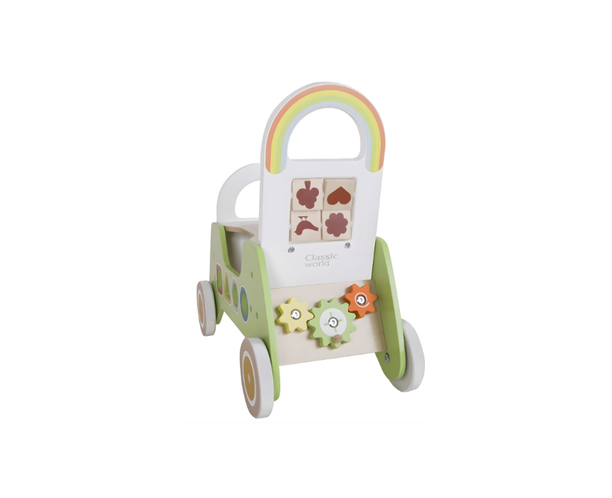 This Classic World ride on walker is suitable for children aged 18 months and above and includes 5 interactive pieces. Designed for children who have just learned to walk it can be ridden pushed around the house and enjoyed through fun features like puzzles turning wheels and a shape sorter. It supports playtime enjoyment while helping develop balance coordination and motor skills.