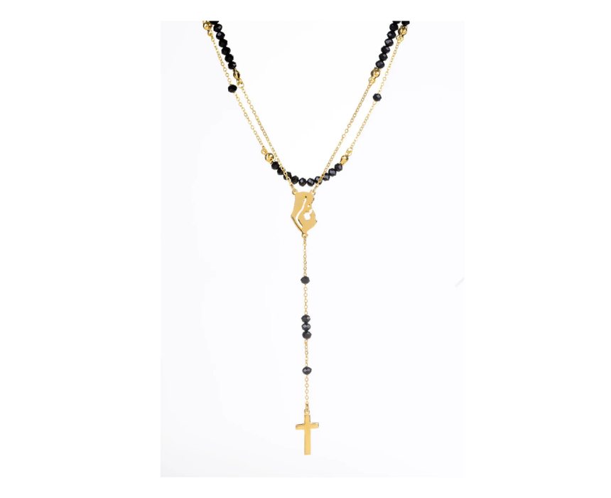 This rosary necklace features a delicate chain with evenly spaced beads and a symbolic pendant, offering a timeless and meaningful addition to any jewelry collection. Designed for everyday wear, it can be styled alone for a classic look or layered with other pieces for a modern touch. Its versatile design complements both casual outfits and more elegant attire.