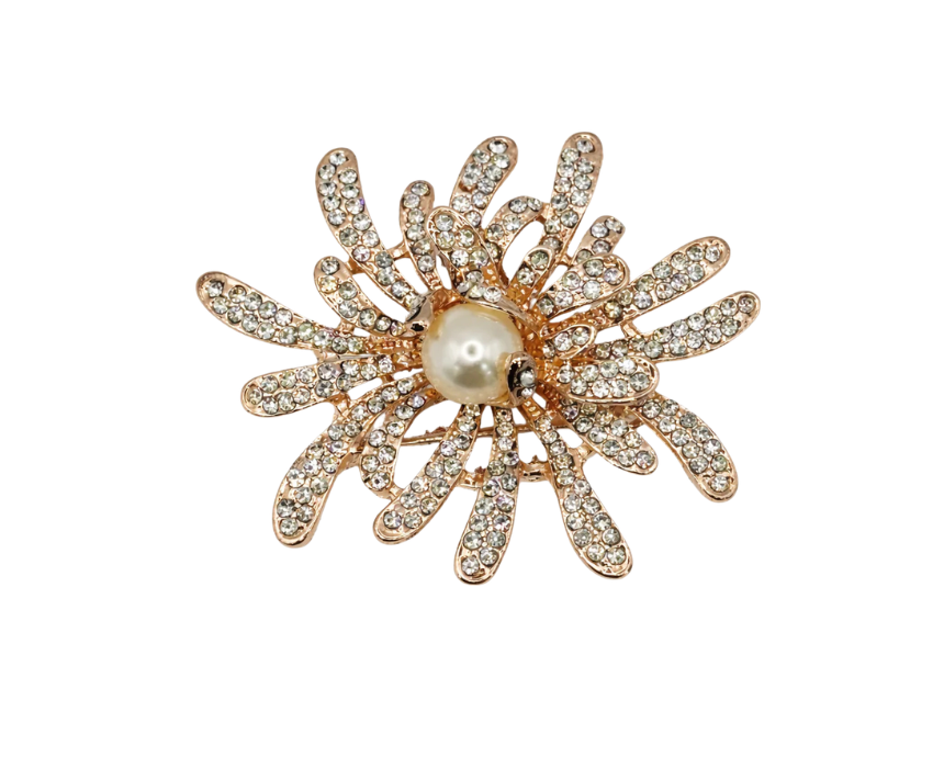 This brooch features a starburst fireworks design in a rose gold tone, accented with sparkling crystals and a luminous pearl center for a refined statement piece. Crafted with intricate detailing, it can be styled on jackets, blazers, dresses, scarves, hats, or bags to elevate both everyday outfits and special occasion looks with a touch of elegance and brilliance.