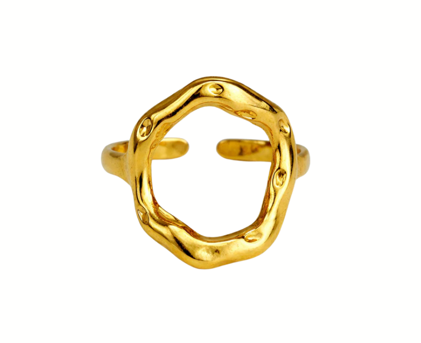 This round asymmetrical ring features a modern and distinctive design that adds a unique touch to everyday or special occasion outfits. Its balanced yet irregular shape creates a subtle statement while remaining comfortable for daily wear. Style it as a standalone accessory for a minimal look or combine it with other rings to create a trendy layered effect that complements both casual and formal attire.