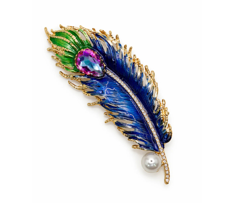 This brooch features a royal peacock feather design accented with amethyst hued crystal details, creating a rich and elegant statement piece with a luxurious appeal. Crafted with intricate detailing and a refined finish, it can be styled on jackets, blazers, dresses, scarves, hats, or bags to add a sophisticated accent and elevate both casual and formal outfits with vibrant color and sparkle.
