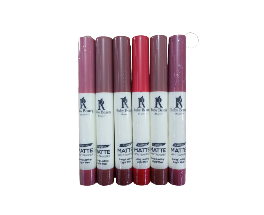 Ruby Beauty matte lipstick non-transfer RB-2001 delivers rich color with a smooth matte finish designed for long lasting wear. Its lightweight formula glides easily on the lips, providing even coverage while helping resist smudging and transfer. Applied directly to the lips, it enhances definition and creates a bold, polished look suitable for everyday or glam makeup styles.
