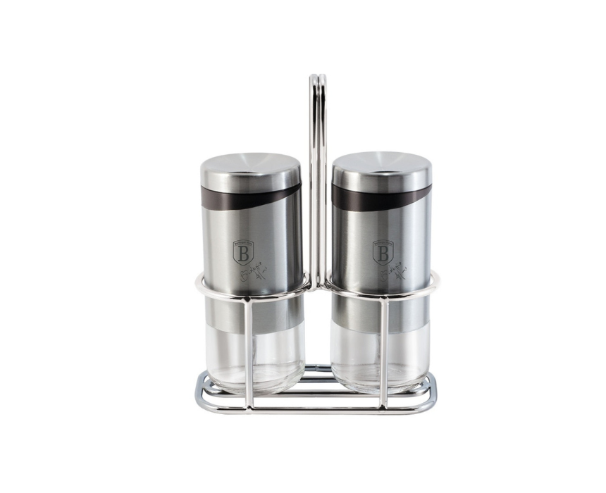 The Berlinger Haus stainless steel and glass spice rack set includes two 120 ml shakers on a rotatable rack, combining practicality and style. The clear glass shakers allow easy visibility of spices, while the sleek stainless steel finish adds elegance to any kitchen countertop. Compact and easy to use, it keeps your favorite seasonings organized and accessible.