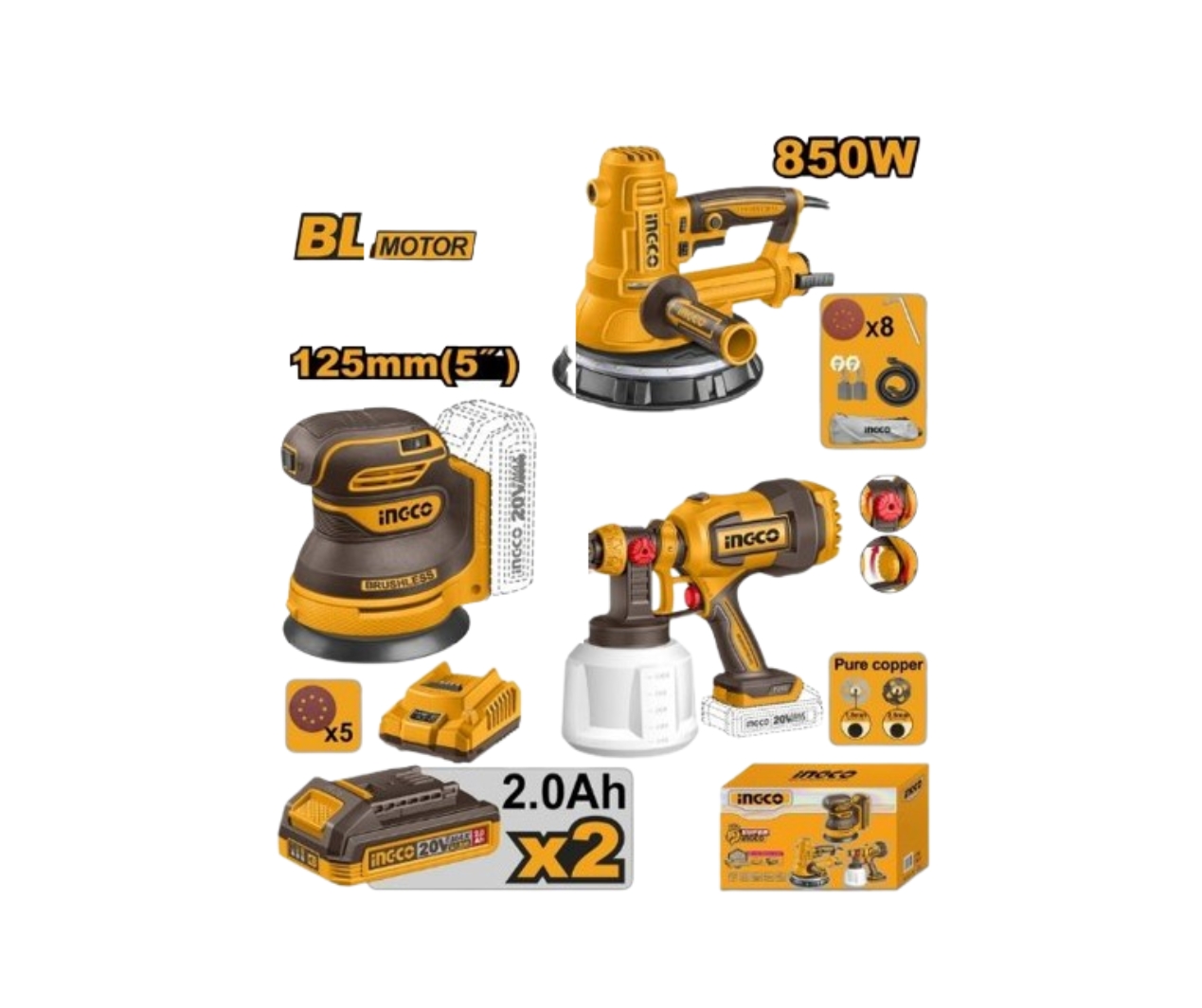 The 3 IN 1 Sander + Spray Gun Combo is a 20V cordless power tool set including battery-powered sanders and a paint spray gun. Comes with 2 x 2Ah batteries and is ideal for smooth finishing and painting tasks for DIY or professional projects.