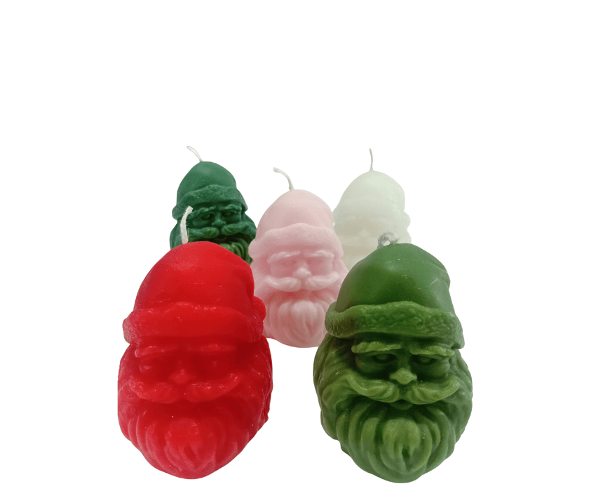 Natural beeswax candle shaped like Santa Claus head. Handmade and available in red, green, and white. Colors can be customized upon customer request. Perfect for festive decoration or gifting during the holiday season.