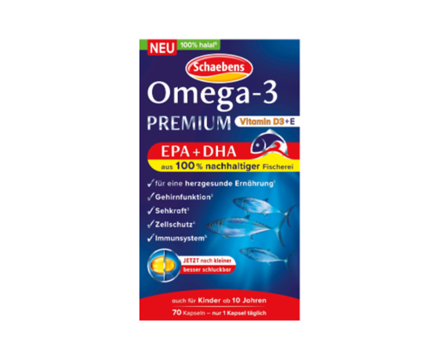 <p>Schaebens Omega 3 Premium Capsules come in a pack of 70 and provide EPA and DHA sourced from 100 percent sustainable fisheries. The easy to swallow capsules support overall health and are suitable for children aged 10 and over. Incorporate them into a daily routine for convenient omega-3 intake and wellness support.</p>