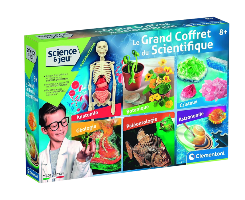 This comprehensive science experiment kit lets children aged 8+ explore anatomy, botany, paleontology, crystals, astronomy, and geology through a wide range of hands-on activities. Featuring many accessories and a detailed illustrated manual, it guides kids safely through each experiment while encouraging curiosity and scientific thinking. Designed and developed in Italy, it is best used on a large table or desk to organize tools and fully enjoy the learning experience.