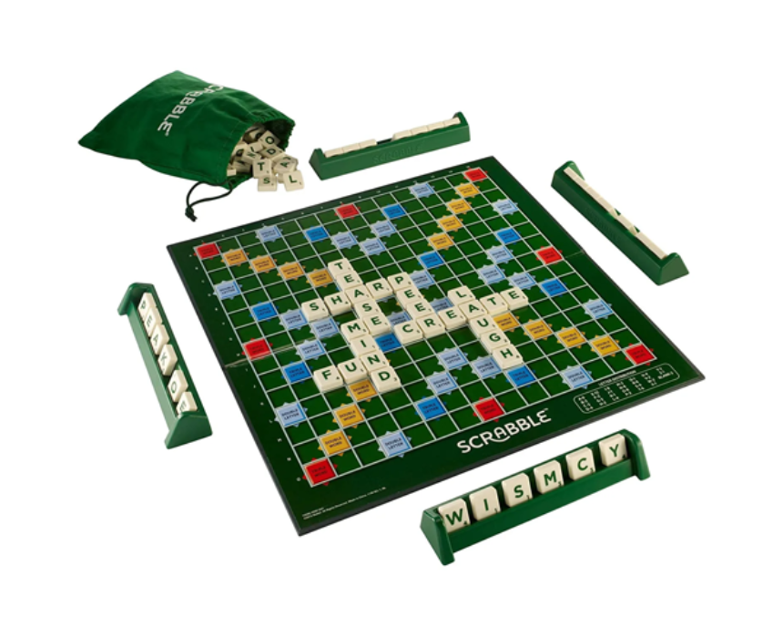 The Scrabble Word Game is a classic board game where players build interlocking words to score points using letter tiles and a premium grid board. It is best styled on a flat table with neatly arranged tiles and racks, making it perfect for family game nights, learning sessions, or relaxed social gatherings.