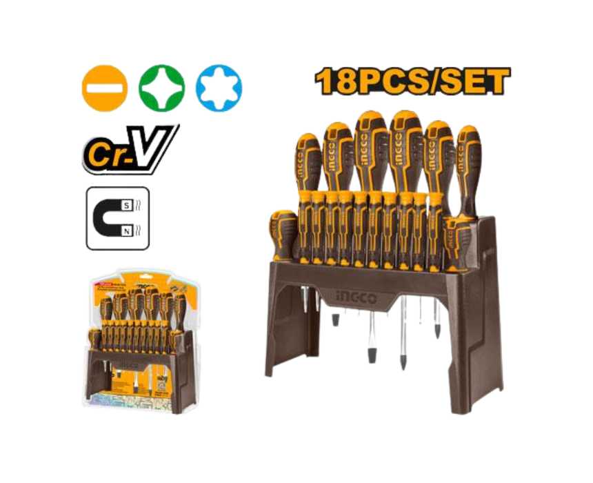 The Ingco 18 Pcs Screwdriver Set Stand 1828 offers a versatile collection of screwdrivers for everyday repair and assembly tasks. Each tool is designed for durability and precision, making it ideal for DIY projects, electronics, and household use. The included stand keeps all pieces organized and easily accessible.