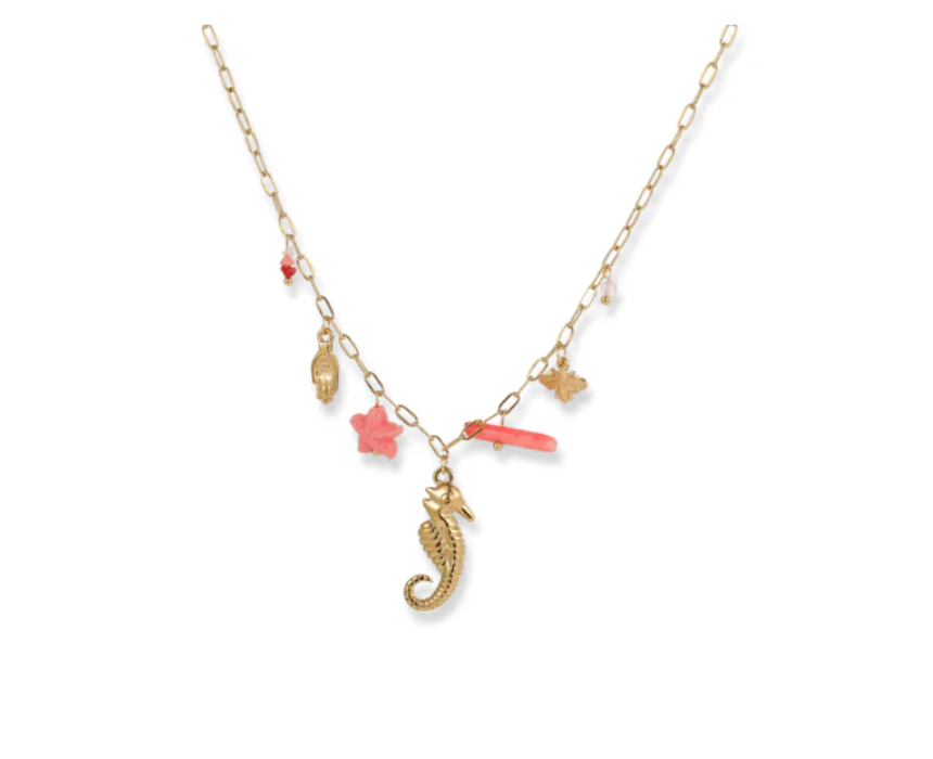 The Seahorse Charms Necklace features detailed seahorse charms on a durable chain, offering a whimsical and ocean-inspired accessory for any outfit. Designed for everyday wear, it adds a playful yet elegant touch to casual and layered looks. Wear it alone for a statement piece or combine it with other jewelry to create a personalized, marine-themed style.