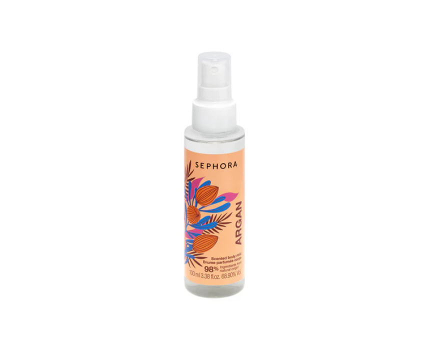 Argan Scented Body Mist by Sephora 100ml is a light refreshing mist for hair and body enriched with argania spinosa extract that gently perfumes the skin with a warm nutty scent. Dermatologically tested and made with a vegan formula containing ninety eight percent ingredients of natural origin, it is ideal for use after a shower or anytime for a subtle aromatic touch and can be lightly sprayed on hair for a soft fragrant finish.