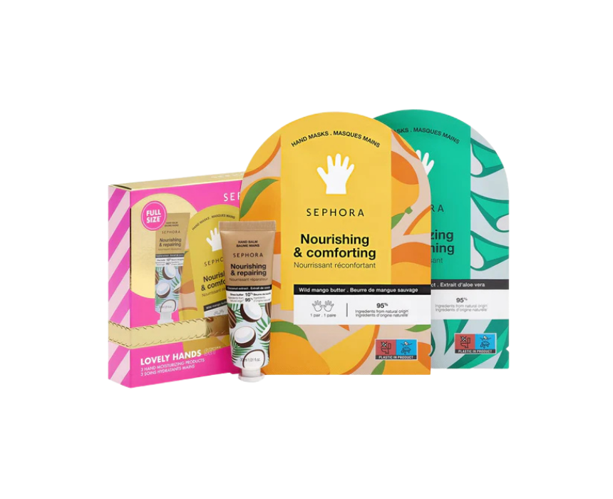 This hand care gift set includes three products designed to nourish, hydrate, and soften dry hands throughout the season. It features two hand masks with different benefits and a moisturizing hand balm for long-lasting comfort. Together, they help improve skin softness and hydration while providing a complete hand care routine, perfect for winter or daily use.