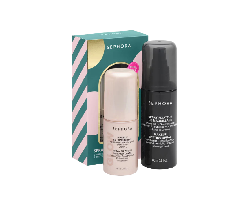 This makeup setting spray duo is designed to lock in your look while offering two different finishes for versatile wear. It includes a satin-finish spray and a glow version that helps refresh and brighten the complexion. Together, they help extend makeup wear, resist humidity and transfer, and keep your look fresh and long-lasting throughout the day or night.