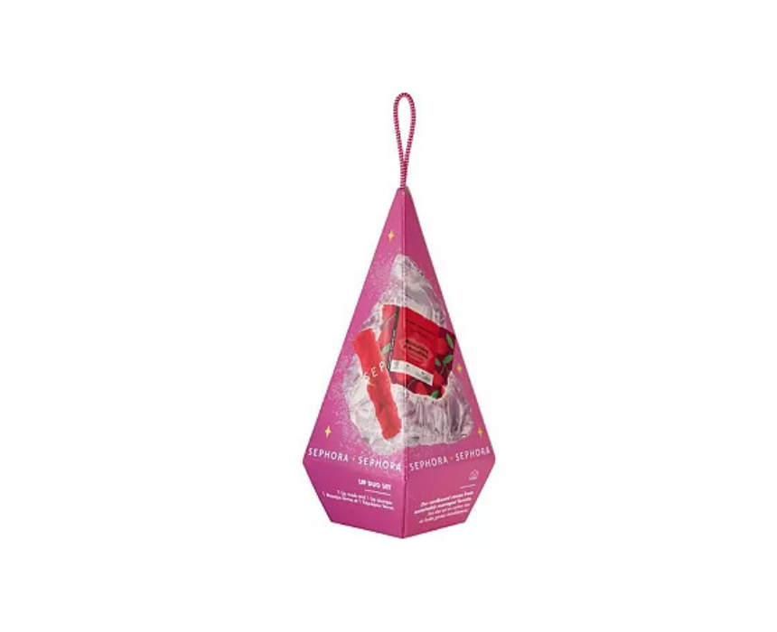 The Sephora Lip Duo Set is a festive gift featuring a Cherry Extract Lip Mask for deep hydration and smooth lips, and an Outrageous Intense Lip Plumper in 03 Flame for instant volume and a bold red finish. Packaged in a charming box with a cord for hanging on the Christmas tree, this duo provides lip care and makeup in one convenient set. Apply the mask for five minutes then massage in the product and use the plumper with the applicator for fuller, festive lips.