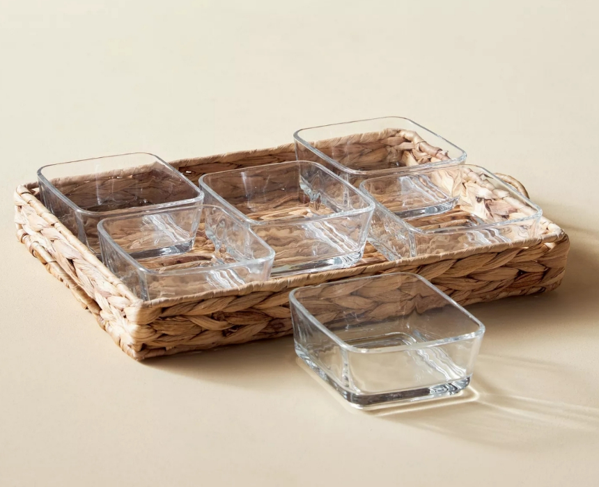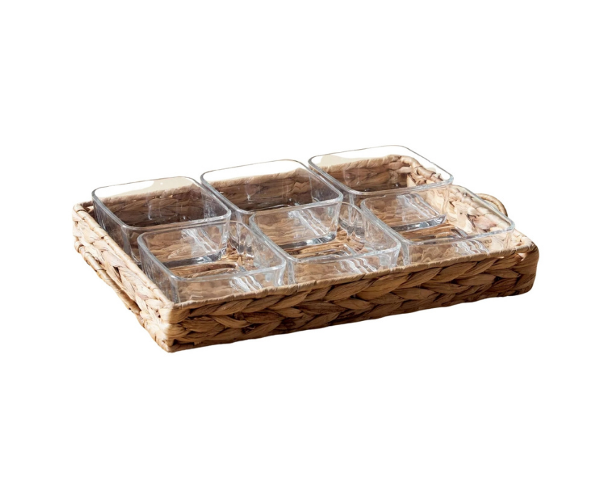 This bowl and tray set measures 15 x 14 cm and is perfect for serving snacks and finger foods during family gatherings. The set includes six glass bowls paired with a sturdy rectangular water hyacinth tray, offering both style and functionality. Ideal for presentation, it makes a great addition to your serving collection.