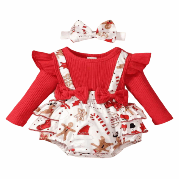This adorable 2-piece Baby Red Suspender Romper Set includes a white ruffled long-sleeve top, a red suspender-style romper with layered ruffles, and a matching bow headband. Perfect for Christmas photos, family gatherings, or everyday wear, it is soft, comfortable, and stylish for babies aged 12–18M.