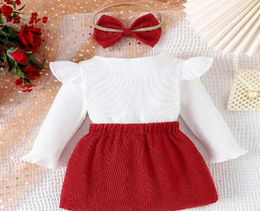 This adorable 3-piece Button Skirt Set features a white ribbed long-sleeve top, a red skirt with button details and a large bow, and a matching red headband. Soft, cozy, and perfect for family photos, holidays, or special outings, it combines comfort with festive style for babies aged 12–18M (80–86 cm).