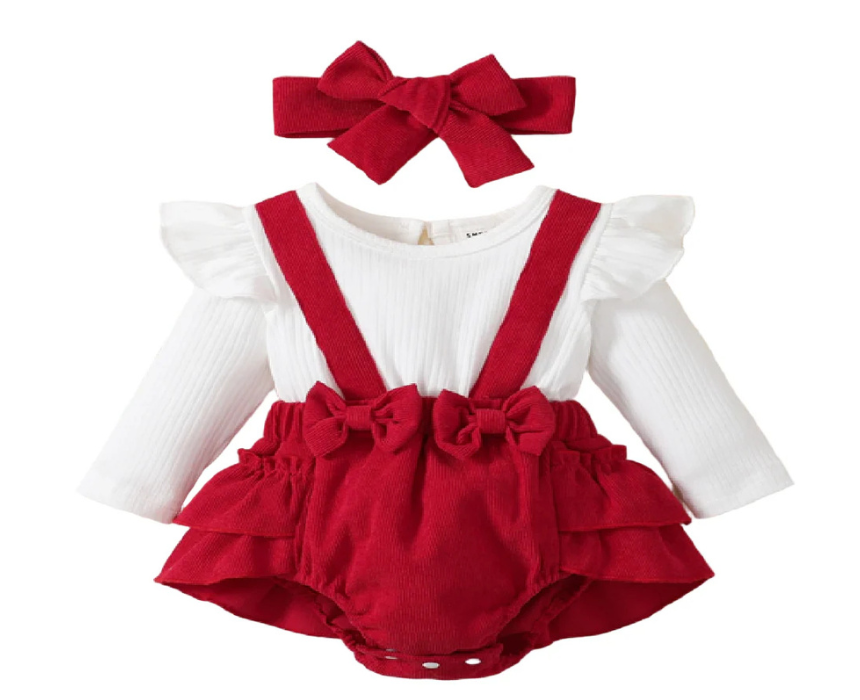 This adorable 2-piece Baby Red Suspender Romper Set includes a white ruffled long-sleeve top, a red suspender-style romper with layered ruffles, and a matching bow headband. Perfect for Christmas photos, family gatherings, or everyday wear, it is soft, comfortable, and stylish for babies aged 12–18M.