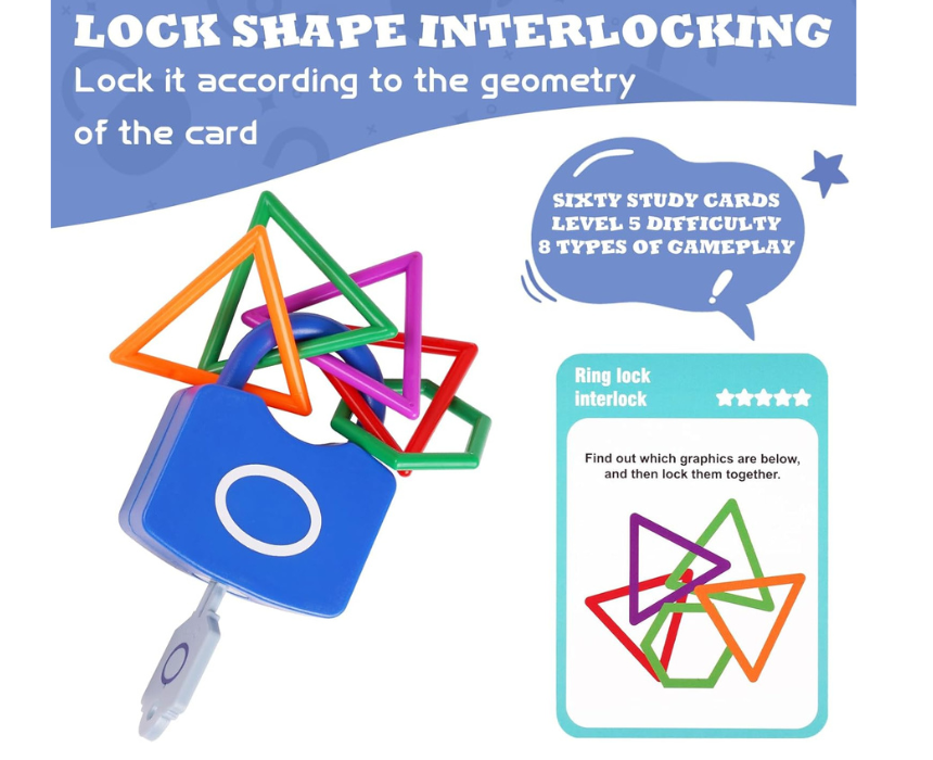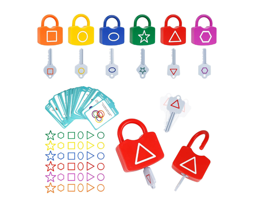 This educational playset enhances early learning by helping children recognize shapes and colors through interactive matching activities with locks and keys. Featuring multiple pieces and learning cards, it supports cognitive development, fine motor skills, and problem solving in a fun and engaging way. Made from safe and durable materials with smooth finishes, it is ideal for home or classroom use.