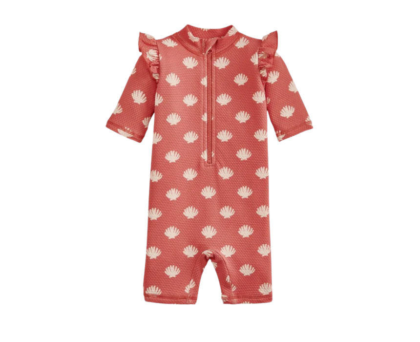 This Shell All Over Print Rashsuit is a fun and practical swimwear piece, featuring a vibrant all-over shell print and long sleeves for sun protection. Made from soft, quick-drying fabric, it’s perfect for beach days or poolside fun and can be paired with a sun hat and water shoes for complete coverage and comfort.