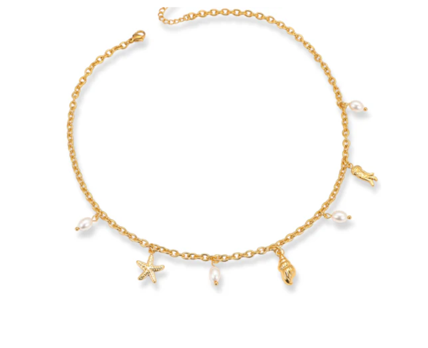 The Shells Charms Necklace features a collection of delicately crafted shell charms on a durable chain, bringing a coastal and stylish touch to any outfit. Designed for everyday wear, it adds a beach-inspired charm that complements both casual and layered looks. Wear it alone for a statement piece or pair it with other jewelry to create a personalized, ocean-themed style.