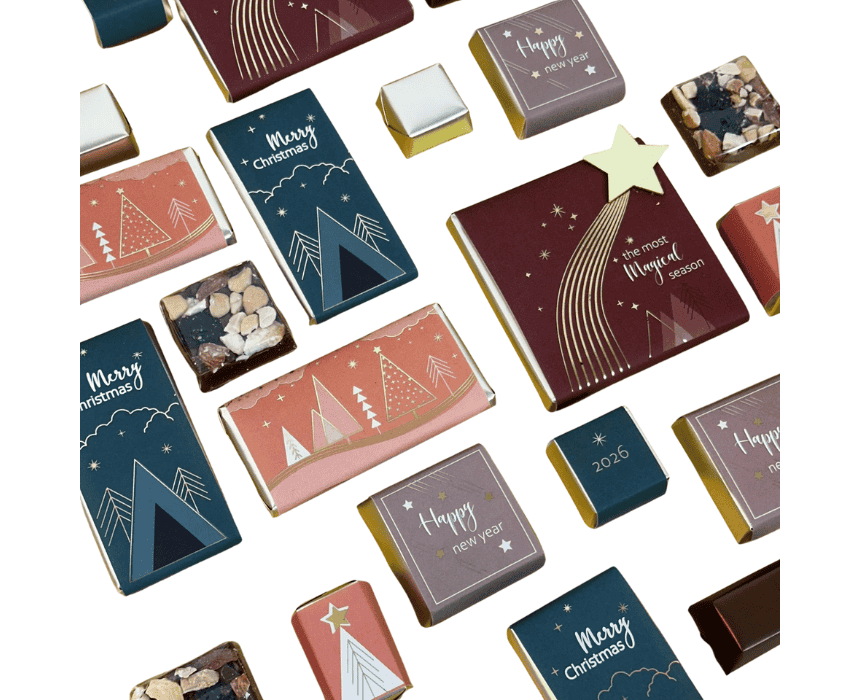 Indulge in festive chocolate of the shining star theme, designed with utmost elegance, filled with unique flavors and printed with hot foil stamping to give that shine that will take your breath away!