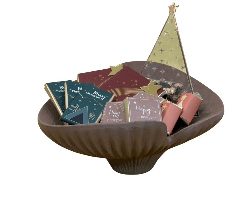 This refined resin bowl, meticulously crafted in warm brown tones, showcases an exquisite collection of gleaming chocolates. An understated yet impactful gift, it brings timeless elegance to the holiday season while offering a sophisticated indulgence for discerning palates.