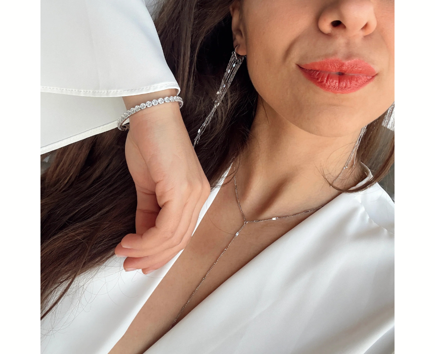 This shiny silver jewelry set includes a bracelet, a necklace, and a pair of earrings designed to create a coordinated and elegant look. Its versatile design makes it suitable for both everyday wear and special occasions, adding a polished touch to any outfit. Wear the pieces together for a complete set or mix and match individually to complement casual or formal styles.
