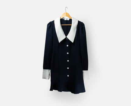 Elevate your wardrobe with our chic navy shirt dress adorned with crisp white details. Effortlessly combining sophistication with casual charm, this shirt dress is a versatile addition to any ensemble.