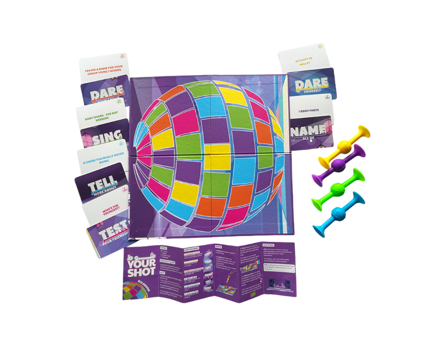 Shoot Your Shot is a thrilling party board game designed for unforgettable nights with friends and family. Featuring 120 cards, a board, four suction cups, and a rulebook, this game is perfect for laughter-filled rounds of questions and dares. Suitable for three or more players, it lasts about an hour and is ideal for adults 18+. Whether using beer, wine, liquor, juice, or water, please drink responsibly. Proudly designed and manufactured in Lebanon, it brings excitement to any gathering Designed for aged 18+.