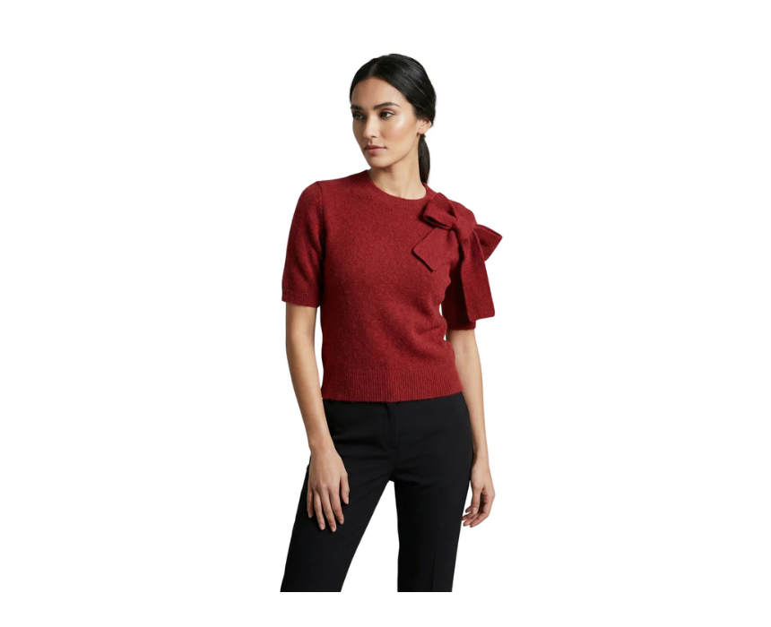 This short sleeved bordo sweater features a soft knit texture with a refined ribbon design that adds a stylish, feminine accent. Designed for comfortable everyday wear, it offers a lightweight feel suitable for transitional seasons and casual outings. It can be styled with jeans, skirts, or tailored trousers for an easy, polished look.