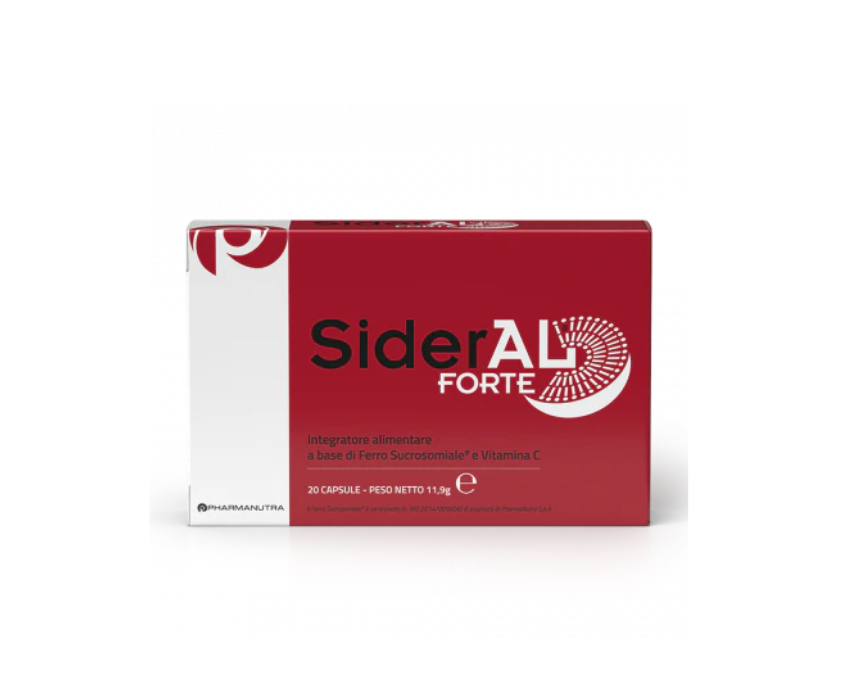Sideral Forte by Pharmanutra is a food supplement with 20 capsules formulated with Sucrosomial Iron and Vitamin C to support iron intake in cases of deficiency or increased need. Each capsule provides 30 mg of iron and 70 mg of vitamin C using Sucrosomial Technology to enhance absorption while being gentle on the stomach. Take one capsule daily with water at any time of day and continue normal daily routines with ease.