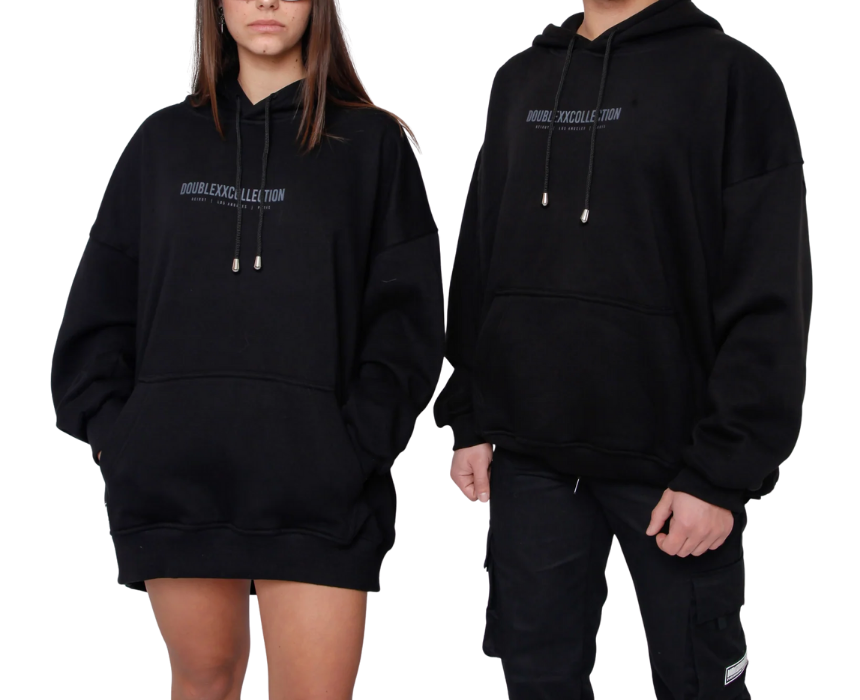 This Signature Hoodie in black is a premium oversized hoodie crafted from heavy three-fleece fabric for superior warmth and durability, designed for men and women. It features a relaxed fit, adjustable hood ropes, and a high-density chest print reading “DOUBLEXXCOLLECTION” with Beirut | Los Angeles | Paris for a timeless global touch. Style it with jeans, joggers, or layered over a T-shirt for an effortless everyday streetwear look.