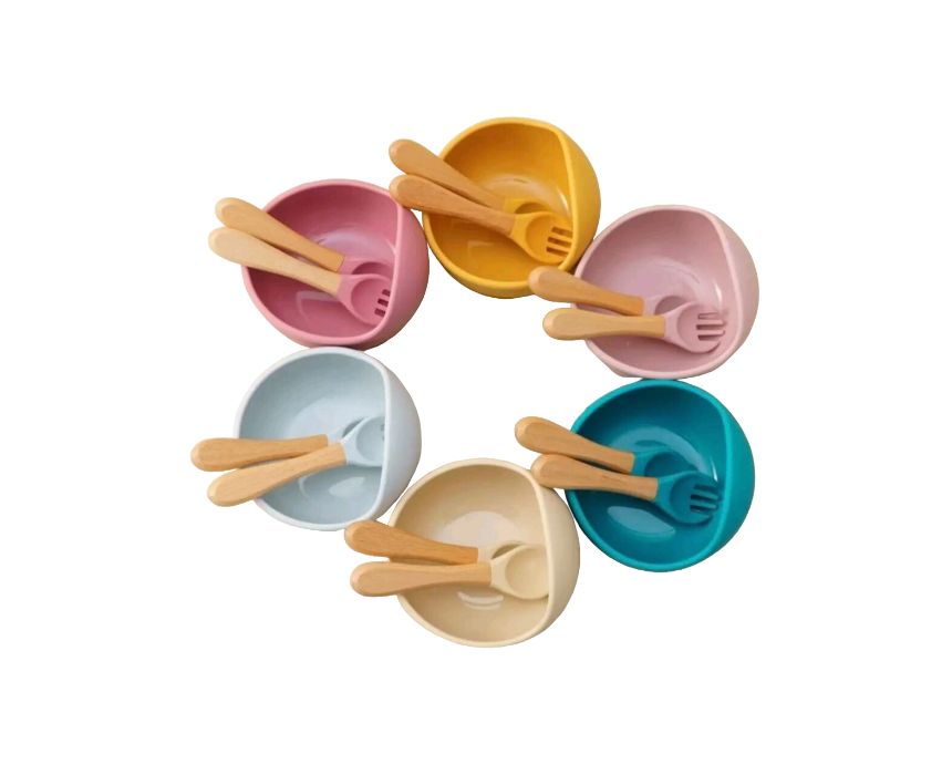 This 3-piece silicone baby feeding bowl set includes a suction bowl, wooden-handled spoon, and fork, designed to support self-feeding and learning. Made from safe, food-grade silicone, the bowl sticks securely to surfaces to reduce spills, while the ergonomic utensils are perfect for little hands. Ideal for babies starting solids, this set combines function, safety, and style for stress-free mealtime.