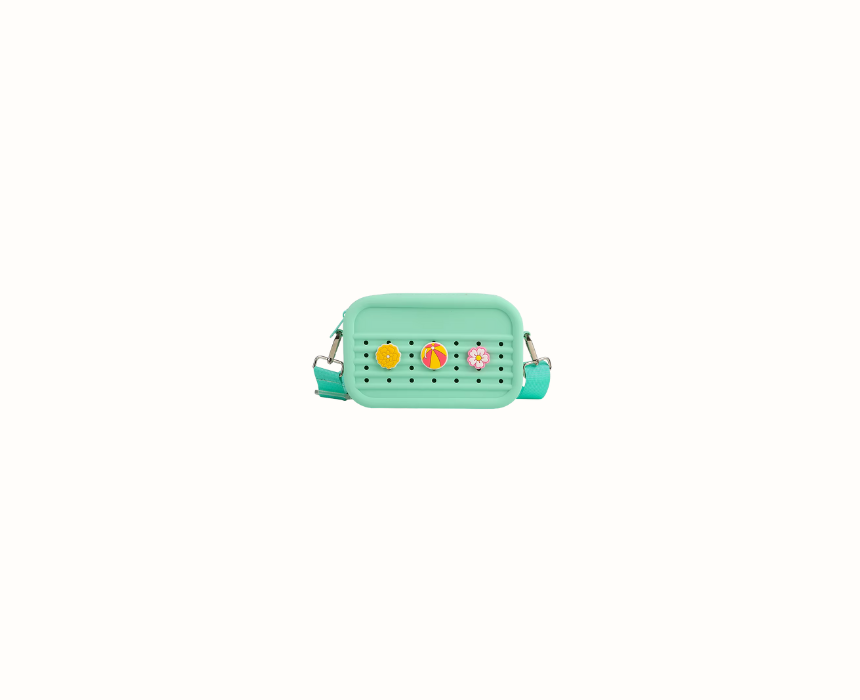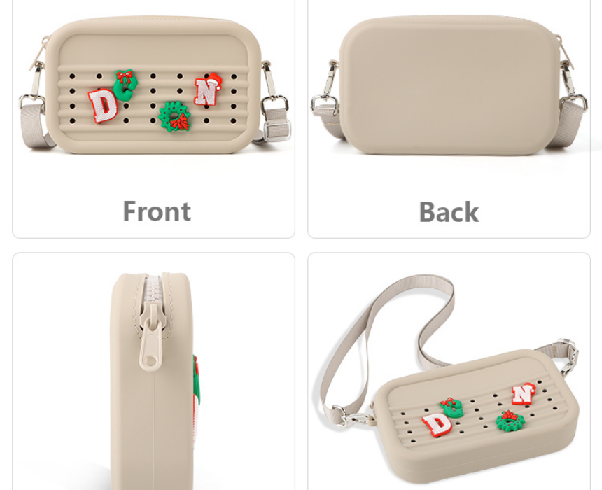 This small silicone handbag is made from high quality waterproof and washable silicone, designed for durability and easy cleaning during beach trips, travel, and daily outings. Measuring 18×12 cm and lightweight at 96 g, it features a unique hole design with 3 decorative charms and a removable adjustable strap, allowing it to be used as a handheld tote or crossbody bag while carrying essentials like a mobile phone.