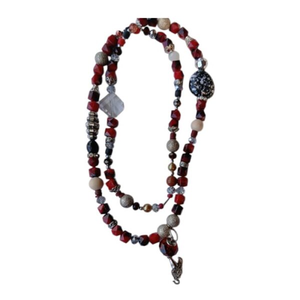 The “Big S. Heart” is a long handmade necklace featuring a cool palette of bluish cubic beads, pearls, and blue/silver crystals. Shining silver balls and separators lead down to a large, beautiful silver heart-shaped pendant. This high-impact piece offers a sophisticated, “icy” look that is perfect for winter or adding a regal touch to any outfit. Meticulously handcrafted to ensure every bead and silver item is perfectly placed for a premium artisan finish.