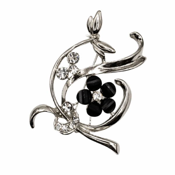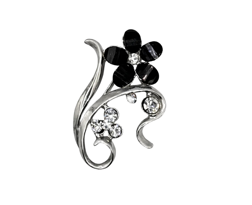 This silver tone brooch features an elegant swirl design highlighted by a black crystal flower for a refined and eye catching finish. Crafted with a smooth polished look, it fastens securely to jackets, blouses, scarves, or dresses, adding a graceful accent. Ideal for both everyday wear and special occasions, it enhances any outfit with timeless style.