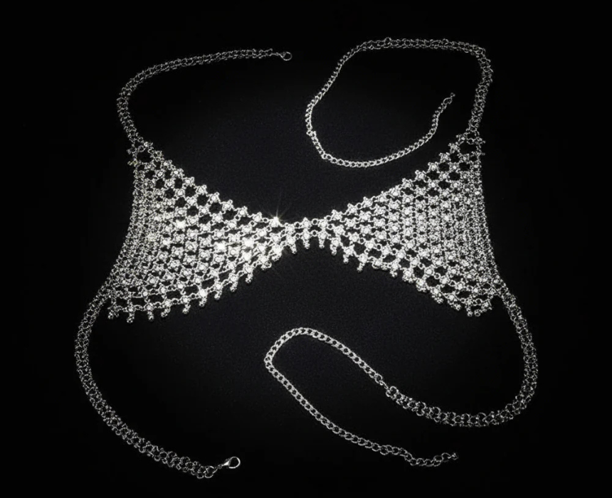 Crafted in silver with a vintage finish, this handcrafted bra blends lingerie allure with bold fashion appeal. Its striking design can be worn subtly under clothing or styled openly as a standout statement piece, making it perfect for daring looks or layered outfits.