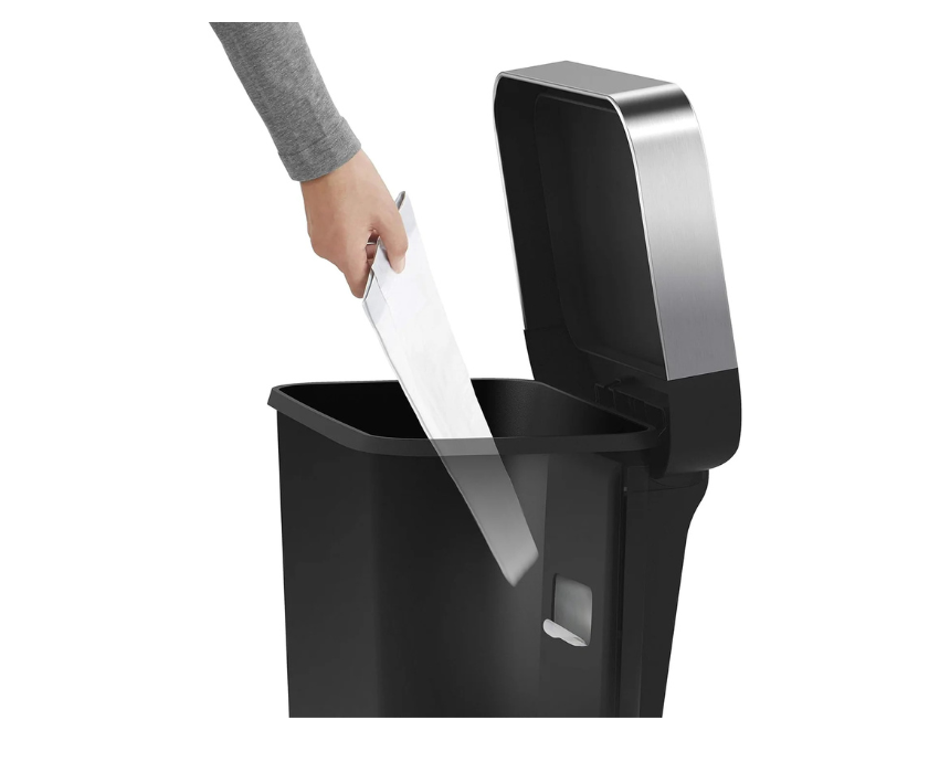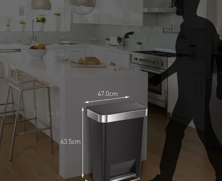 The SimpleHuman CW1385CB Rectangular Pedal Bin has a 45L capacity and features a durable pedal mechanism for hands-free operation, making it ideal for kitchens, offices, or high-traffic areas. Its sleek rectangular design fits neatly against walls and is best styled to complement modern or minimalist interiors while providing convenient waste management.