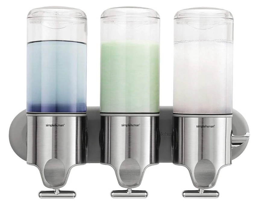 The SimpleHuman Triple Wall Mount Shower Pump BT1029 in stainless steel features three separate pumps for convenient, hands free dispensing of shampoo, conditioner, and body wash. Its sleek design keeps products organized and accessible while enhancing modern bathroom aesthetics. Style note: not worn, but looks stylish mounted on the shower wall for a clean, organized, and functional bathroom setup.