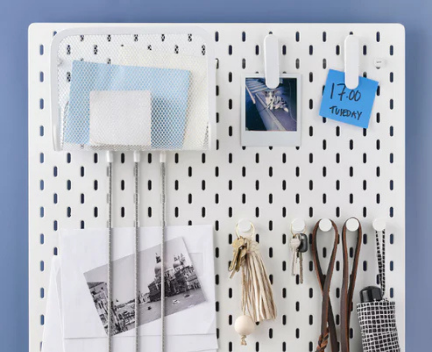 This pegboard system helps keep recipes, photographs, drawings, to do lists, letters, and important papers within easy reach. The accessories are simple to attach and move without tools, allowing you to create a personalized storage solution. Ideal for kitchens, hallways, desks, or any room, it makes organization effortless and ensures everything you need is easy to find.