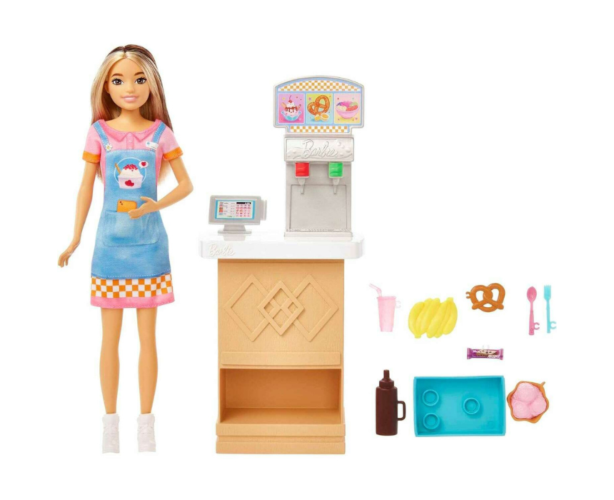 The Barbie Skipper Snack Bar Playset lets kids enjoy imaginative play as Skipper works as a snack bar attendant. Featuring a snack counter with soft-serve machine, register, color-change sundae, and eight accessories, kids can transform desserts with warm or cold water for repeated fun. Designed for ages 3+, this set includes additional pieces and a to-go tray for creative storytelling and makes a perfect gift for young Barbie fans.