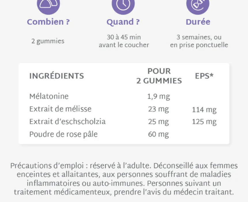 Sleep Gummies are formulated with 1.9 mg of melatonin and a blend of calming herbs including lemon balm, California poppy, and pale rose to support natural sleep onset, improve sleep quality, and promote restorative nights. Designed for those experiencing difficulty falling asleep or nighttime awakenings, they help calm racing thoughts and restore balance, and can be easily incorporated into a nightly wellness routine without habit formation.