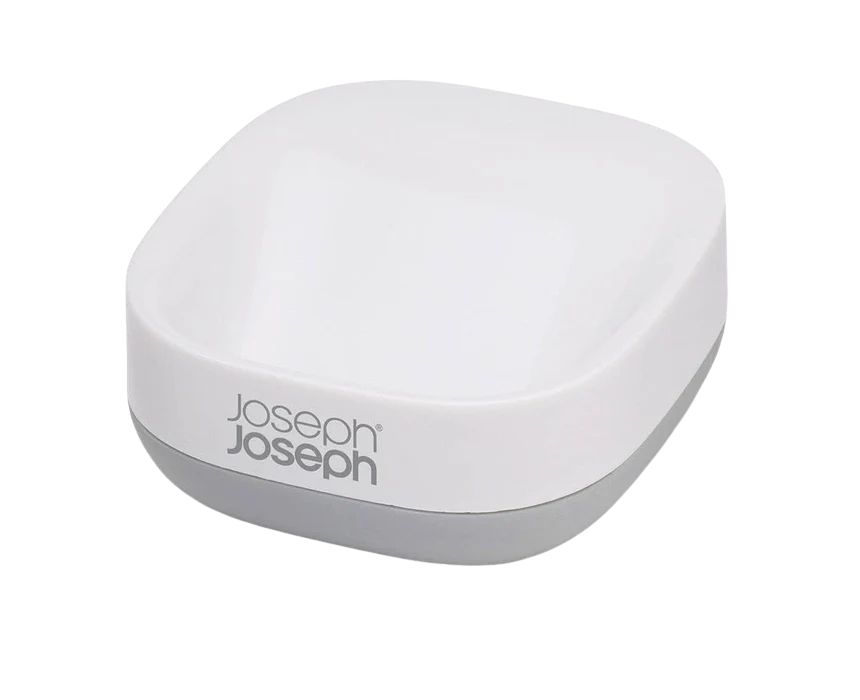 The Joseph Joseph 70511 Slim Compact Soap Dish in white features a unique sloping design that saves space while holding a full-size soap bar. Its angled base allows water to drain efficiently, and the ventilated structure ensures quick drying. Dismantlable for easy cleaning, this compact soap dish measures 7.7 x 3.6 cm and is ideal for small bathrooms or sinks.