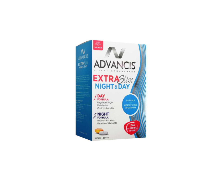 Advancis Extra Slim Night & Day is a dual‑phase weight management supplement designed to support slimming around the clock. The day formula combines Garcinia cambogia, L‑Carnitine, chromium, and fibers to aid fat metabolism, appetite control, and sugar balance. The night formula features CLA (conjugated linoleic acid) to reduce body fat mass and promote lean muscle, helping reshape the silhouette. For best results, take one tablet at breakfast and one capsule after dinner, alongside regular exercise and a balanced diet.