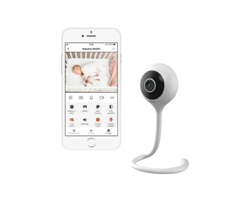 Designed for newborns, this smart baby video monitor camera allows parents to keep a close eye on their baby through a connected mobile application with unlimited range access. It features a wide viewing angle, motion and sound detection alerts, two-way audio communication, and night vision for clear monitoring at all times. Additional functions include built in lullabies, temperature and humidity sensors, and flexible storage options via SD card or cloud, making it a reliable solution for everyday baby monitoring.