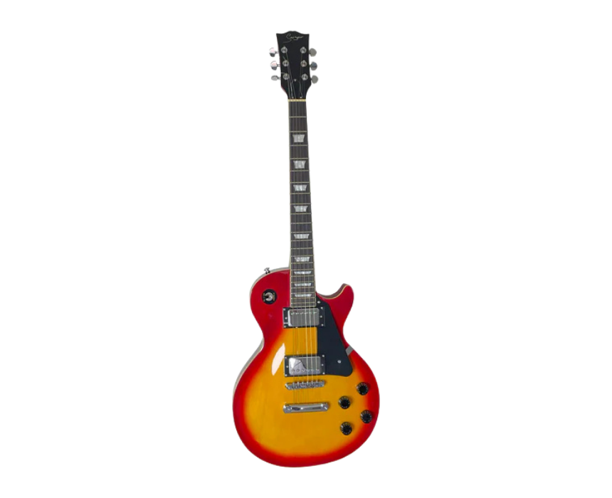 The Smiger LP Style Cherry-Burst guitar features a 3-piece mahogany body and maple neck with a satin finish, delivering classic Les Paul tones through dual humbuckers. Its Richlite fingerboard, 22 frets, vintage-style bridge, and die-cast tuners ensure smooth playability and tuning stability. Complete with a padded gig bag, this guitar is ideal for both practice and performance.